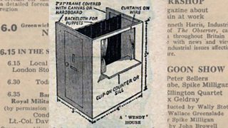 This helpful diagram on the Radio Times listing will help you build the multi-purpose toy. "In its upright position", the caption explains, "it can also be used as a shop with an open front (a kiosk). As a glove puppet theatre, with the backcloth in the high position, the operators sit on the floor. The other way up, with curtains reversed and the backcloth in the low position, it can be used as a marionette theatre, and the operators stand behind."