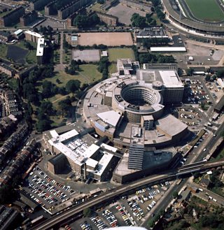 An aerial view of Television Centre in the mid-1970s, when lots more people drove to work and there was still a stadium at White City