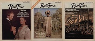 Three productions recording in one week in 1976 made the cover of Radio Times - Our Mutual Friend (photo Dmitri Kasterine), The Chester Mystery Plays (photo Tony Evans, painting Tom Taylor) and The Onedin Line (artwork Nigel Holmes)