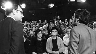 Cliff Michelmore and guest Anthony Smith survey the friendly audience of Talkback in 1968