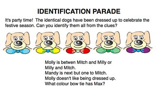 Puzzle One: Identification Parade - MAX has a green bow tie. In order, from left to right, they are MILLY, MOLLY, MITCH, MAX, and MANDY.
