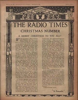1929 The first decade of RT Christmas covers was quite sober, sensible and monochrome, apart from a couple of front pages that were in full and glorious colour, including the very first one. This final cover of the 20s has a long message from "the broadcasters". It reflects the testing times of the Depression, saying "finances... are not what they were".