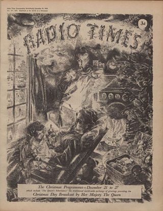 1952 This illustration stands out in the 1950s with a family in a surreal, smoke-filled room warmed by the glow of a wireless set. With just a hint of a Christmas tree and a snow-filled landscape, our contemporary view of the season would take a while to emerge. Queen Elizabeth's first Christmas broadcast is given star billing on this cover.