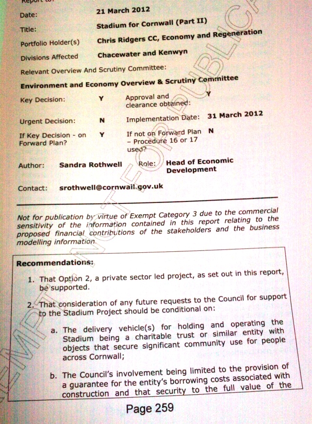 In support of my first point I would quote the suggestion first reported in the West Briton that taxpayers would fund £8m worth of infrastructure to help that project which Inox is really interested in, namely the 1,500-home housing estate. In return, Inox was expected to stump up £7m towards the stadium. A cunning plan to get round the Section 106 rules? Would such a deal be legal? It doesn't feature in the recommendation which was due to have been discussed next week, so I guess it's been quietly dropped.