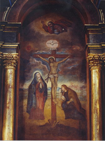 On this mural appears the crucified Black Jesus. Above the cross is the Holy Spirit and God the Father. Below and to the right of Jesus is his mother, the Virgin Mary with her heart pierced by a lance of sorrow and to her right at the foot of the cross is Mary Magdalene.