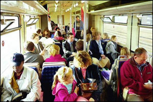 Inside a busy commuter train