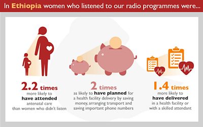 The Ethiopian women who listened to our shows did just that. They were more likely to have: one, received antenatal care, two, made arrangements for having their baby in a health facility and, three, given birth in a facility or with a skilled attendant looking after them.