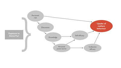 To evaluate the programme, we wanted to know not just what impact watching the programme was having on viewers but also know how this impact was happening. To do this we tested our theoretical model of how we thought change was going to happen (using a statistical technique called structural equation modelling) against data we had collected during surveys and measured the relationship between them. Other teams in BBC Media Action had used structural equation modelling when evaluating our maternal and child health work so we knew it could help us understand what drives people to make changes.