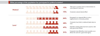 Of course, people don’t just get involved with public life through voting. Meetings, protests, and various forms of communication are all types of political participation. The Sierra Leone visualisation previewed below shows that while only a small proportion of people have been in touch with government officials, nearly two thirds have teamed up with others in their community to solve a problem.