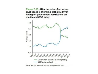 Firstly, the report paints a depressing – if accurate – global picture of closing civic space, accompanied by increasing restrictions on media and civil society organisations (see Figure 8.10 from page 235 of the report below).