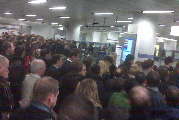This is a photo of the knock-on effect at the Northern Ticket Hall at King's Cross as commuters were held there for 15 minutes due to crowded platforms.
