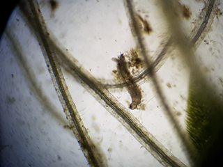 One species seems to jiggle freely in the water. Another seems to make a little hidey-hole out of pond detritus and the third species is living among the leaves of duckweed, feasting on the tiny roots (pictured below). And mosquitos? Yep, on a slightly less positive note, I have had larvae of mosquitos in my mini-pond too, but not as many as I feared. Currently the tally for mosquitos is at six single individuals. Scary? A bit. But remember that half of these are non-biting males (that depend on nectar rather than blood) and the females (I hope) will quickly move away or be eaten by the bats that swoop past in the warm evenings.