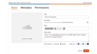 You should select your track to be 'public’ within the 'Basic details' tab. You then need to enable 'downloads' within the permissions tab. This is very important as it will allow us to download your track. If you do not want to post your submission publically, you can also list it as 'private'. Please drop us a line directly at newcomedyaward@bbc.co.uk to make us aware of a 'private' listing.