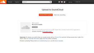 Before you get going on SoundCloud you should record five minutes of your own, unaired on TV or Radio material. This doesn’t need to be recorded with an audience; it just needs to be five minutes in length, audible and either an .mp3 or a .wav.