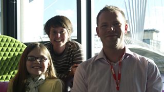 Staff volunteers Karen Millington and Duncan Bloor from BBC Learning with Isobel