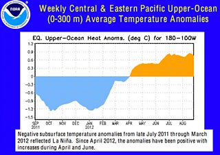The recovery in global temperatures since the turn of the year has in part been due to a rise in sea surface temperatures in the equatorial Pacific, as 'La Nina' conditions faded, shown below.