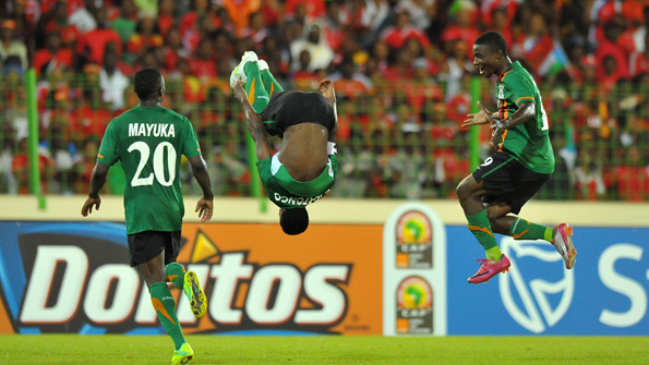 Zambia captain Chris Katongo celebrates his match-winner against Equatorial Guinea in flying fashion, as Emmanuel Mayuka looks on