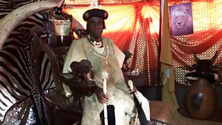The palace as it turned out was yet another little thatched hut behind a straw wall, filled with animal skins, some slightly out of place large armchairs and the Chief himself in full regalia on his mahogany carved throne.