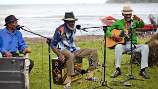 BBC sound engineer Kris McConnachie records the Jolly Boys beside the sea shore in Port Antonio, Jamaica
