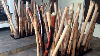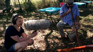 For our recording session we head 20 kilometres south of the city, to the rustic HQ of Didgeridoo Festivals main man Casey Opsteegh. He is hosting a didgeridoo workshop featuring virtuoso player Mark Atkins and as it's also Casey's 50th birthday he has invited along many of his friends from the didge world for a BBQ and special night concert at his ranch. His workshop/studio has the most incredible collection of didgeridoos I have ever seen, these are like works of art, beautifully carved and etched and waiting for life to be breathed into them to create the powerful sound they are so well know for. It is here I have the pleasure of meeting Aboriginal player Adrian Burragubba, he plays the didge to me in it's purest, rawest form and tells me about the concepts of 'dreamtime' and 'songlines'.