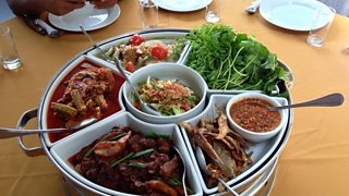 We take a break and head outside to the tropical heat for lunch – which is a traditional dish of fish head curry, blisteringly hot chillis and soup.