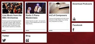 This is where you'll find links to all the important Radio 3 stuff - our newsletter, the blog and social media and to the A-Z index of composers, for instance. We'll also put links here to big seasons and to the BBC Orchestras.