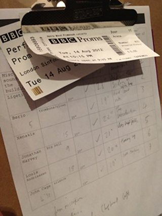 I've recently been working with Matthew on the relaunch of a new Radiophonic Workshop and we've been working with The Space on a number of other related projects. For the live remix of Prom 44 Matthew had a clear vision of what he wanted, and he invited some of the members of the new Radiophonic Workshop, along with some people for the London Sinfonietta to help create the composition. There were 12 volunteers in total, we were each issued with a clipboard and pencil, and were asked to bring along a smart phone - it was the first time I've be told to make sure my phone was fully charged before attending a classical concert!