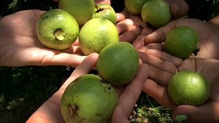 While we waited for him get ready, we were invited to help ourselves to an exotic looking tree in the garden and so had breakfast feast of guavas in the morning sun.