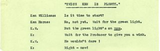 While other teenagers in the nineties were mad for Oasis, I lay in my bedroom listening to cassette tapes of The Goons and Hancock's Half Hour loaned from Manchester's Central Library. For some peculiar reason this love had never extended to Beyond Our Ken and Round the Horne. Yet, as I lay in bed over a decade later, assessing my newly acquired hoard for a new biography of Williams, I began to read the green script. The voices, the sound effects, the jokes, came alive. Headed "Twice Ken is Plenty", the pages only featured Kenneths Horne and Williams. I'd just assumed it was the latter's copy of a Round the Horne episode. Unlike the majority of the other papers it didn't have any of his own annotations, nor did it include the other members of the team (Betty Marsden, Hugh Paddick and the like). Eventually I wanted to hear it for myself, but a call to the BBC archive put me in the picture: "No, it's not one we have listed." I vividly remember thinking this'd make a great radio show in the same style as Flywheel, Shyster and Flywheel, another Radio 4 favourite of mine wherein actors re-created old Marx Brothers' scripts.