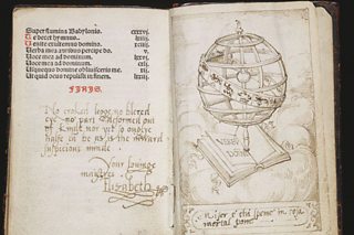 Facing the neat letters is a drawing of an armillary sphere - a model of the heavens and one of Elizabeth's emblems - balancing on an open book, which a gifted amateur artist added to embellish the words.