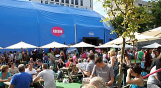 If you don't get into the recording of your favourite Radio 4 show, there is still plenty to do in the BBC Venue. There is a big screen which has broadcast moments from the festival, including Nicholas Parsons discussing 50 Shades of Grey on Just a Minute and Mark Watsons' short story about a disasterous club sandwich on Comic Fringes. You can also have your photo taken in front of our green screen and we will put your picture in a scene of a BBC show of your choice.