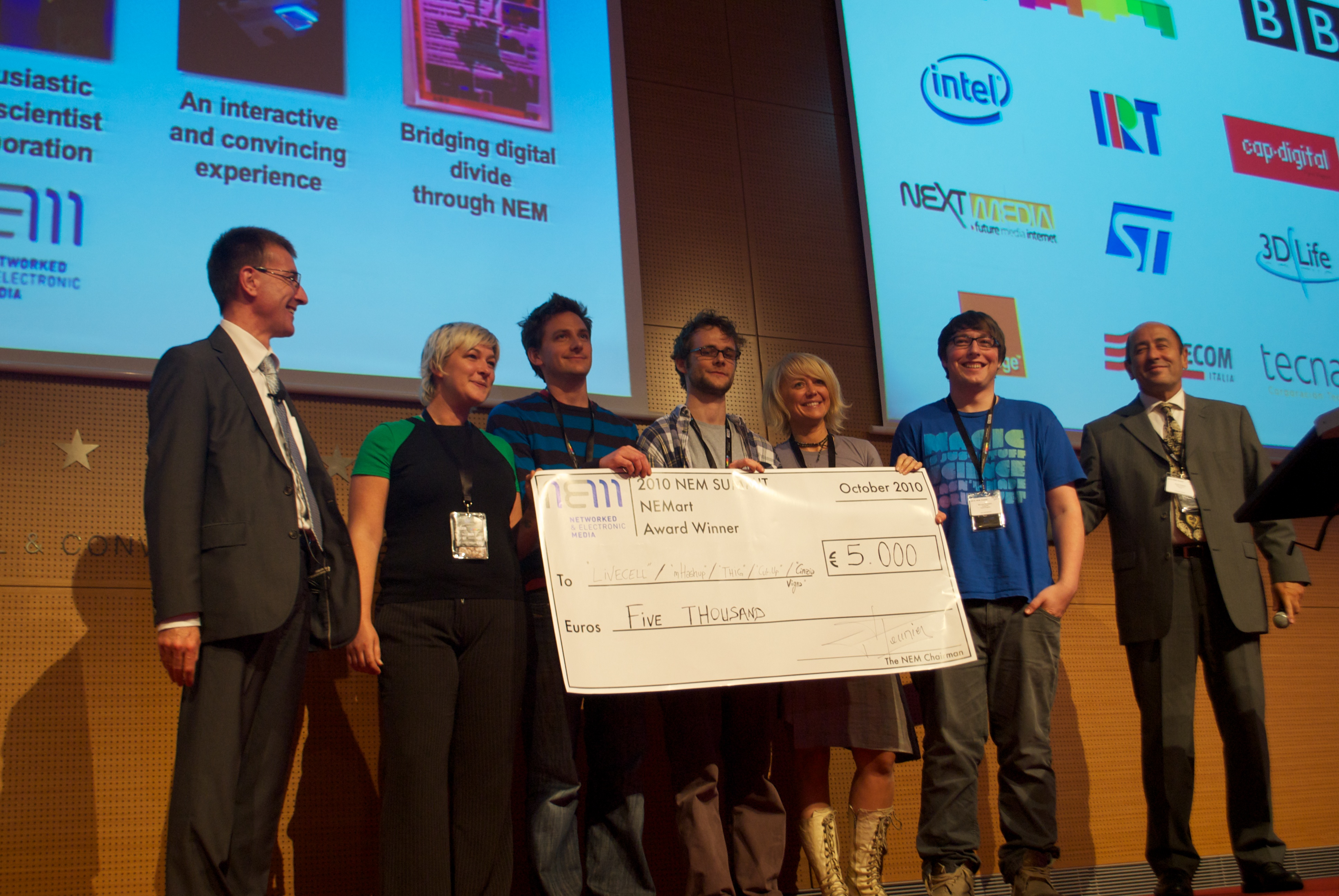 Following this, Roger Torrenti, CEO of Sigma Orionis came up to present the award. With what seemed like an outrageously long pause, he proceeded not to announce a single winner, but went on to explain how the award was going to be split between 5 of the 17 works submitted for the NEMarts prize.
