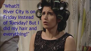 River City Schedule Change Tuesday 11 October 2011, 13:19 Vikki TennantTagged with:ScheduleTvComments Remember that River City won't be in its usual Tuesday night slot this week due to the Scotland vs Spain football match. You can see the next episode at 9pmon Friday 14th October. Watch a clip of what's coming up here.