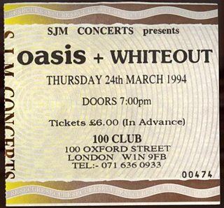 Oasis headline their biggest London gig to date, with a triumphant set at the legendary 100 Club. Support comes from Scottish band Whiteout