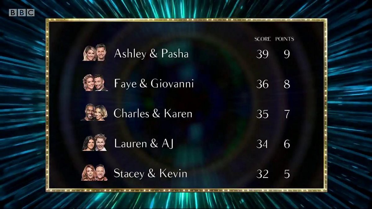 They were followed by Faye and Giovanni who were awarded 36 for their Jive, and Charles and Karen will be hoping to avoid another Dance Off after impressing the judges with their third-place Charleston, getting 35 points.