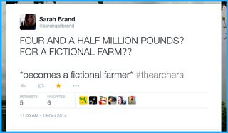 FOUR AND A HALF MILLION POUNDS? FOR A FICTIONAL FARM?? *becomes a fictional farmer* #thearchers (@sarahgailbrand on Twitter)