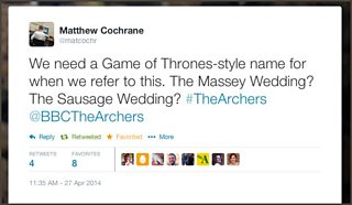 We need a Game of Thrones-style name for when we refer to this. The Massey Wedding? The Sausage Wedding? #TheArchers@BBCTheArchers (@matcochr on Twitter)