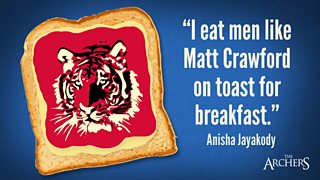 Quote of the week: Tiger on toast? Thursday 20 April 2017, 23:18 Radio 4CommentsIt didn't take long for Matt to start scoping Ambridge for some... female company (and at Justin and Lilian's engagement party too).Rex dashed to Anisha's rescue. But Ms Jayakody is no damsel in distress...Tiger on toast? Better luck next time, Matt...