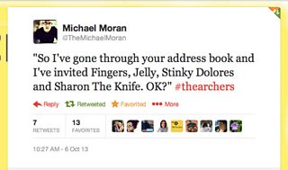 "So I've gone through your address book and I've invited Fingers, Jelly, Stinky Dolores and Sharon The Knife. OK?" #thearchers (@TheMichaelMoran on Twitter)