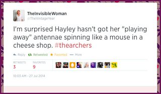 I'm surprised Hayley hasn't got her "playing away" antennae spinning like a mouse in a cheese shop. #thearchers (@TheVintageYear on Twitter)