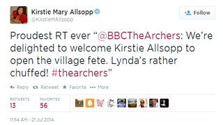 Fallon is getting very excited because her upcycling heroine Kirstie Allsopp will be opening the Ambridge village fete this Sunday. And Kirstie herself is pretty excited too, as you can see by the retweet from her Twitter account.