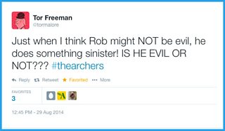 Just when I think Rob might NOT be evil, he does something sinister! IS HE EVIL OR NOT??? #thearchers (@tormalore on Twitter)