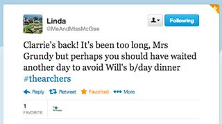 Yay, Clarrie's back!!! #thearchers (@DaveWhe on Twitter)
