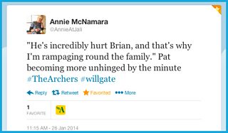 "He's incredibly hurt Brian, and that's why I'm rampaging round the family." Pat becoming more unhinged by the minute #TheArchers#willgate (@AnnieAtJali on Twitter)