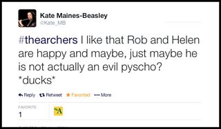 #thearchers I like that Rob and Helen are happy and maybe, just maybe he is not actually an evil pyscho? *ducks* (@Kate_MB on Twitter)