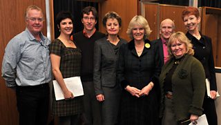 - Main picture shows the Duchess of Cornwall in The Archers studio. (l-r) Graham Blockey (Robert Snell), Jasmine Hyde (Leonie Snell), Roger May (James Bellamy), Vanessa Whitburn (Archers editor), HRH Duchess of Cornwall, Kim Durham (Matt Crawford), Sunny Ormonde (Lilian Bellamy), Carole Boyd (Lynda Snell)