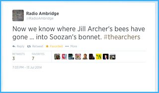 RadioSoosan in full, tactless flow there. Glorious! #thearchers (@purplehelen on Twitter)