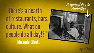 "Why have we ended up here, Justin, in Ambridge?... The whole area's so barren!" despaired Miranda as she surveyed the godforsaken cultural wasteland where Justin has inexplicably chosen to spend so much of his time.