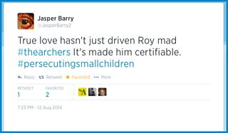 True love hasn't just driven Roy mad #thearchers It's made him certifiable. #persecutingsmallchildren (@JasperBarry2 on Twitter)