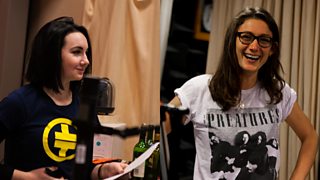 Lucy Morris (Phoebe) and Daisy Badger (Pip) wearing their band tshirts to work.